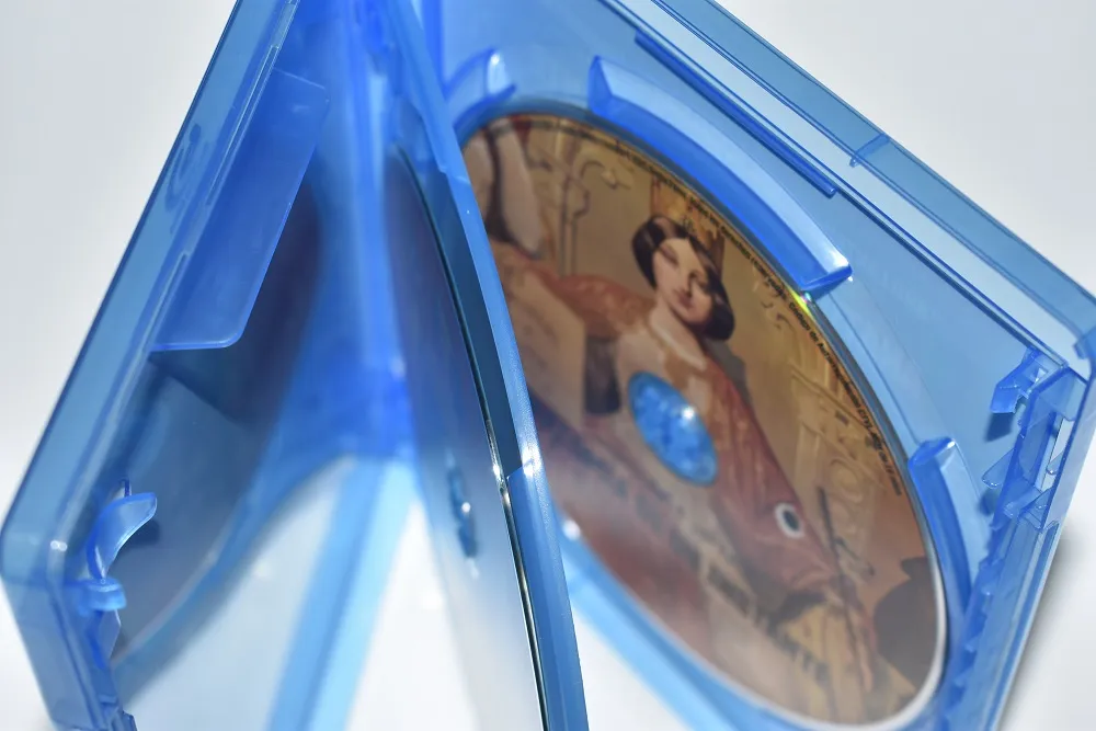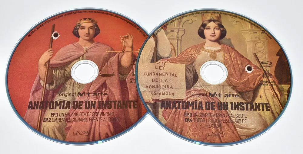 Por dentro tenemos una «multibandeja» que alberga los dos discos Blu-ray, que vienen serigrafiados con arte personalizado. En este caso apuestan por una imagen simbólica que refuerza el contexto político e histórico de la serie.