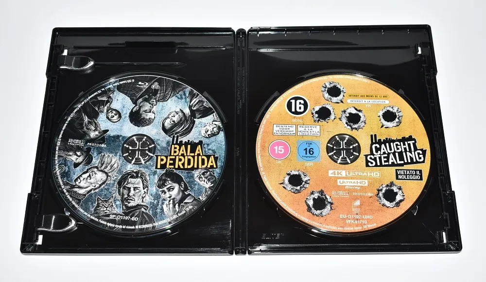 En el interior encontramos los dos discos bien diferenciados: el 4K, con los clásicos agujeros de bala como motivo visual y el Blu-ray, con un diseño alternativo con los personajes, en tonos más fríos, manteniendo coherencia estética pero sin reciclar exactamente la misma imagen.