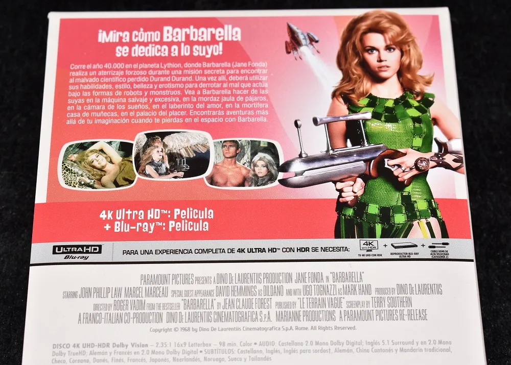 Aquí es donde Paramount Pictures (con distribución de Divisa Films) se ha venido arriba y ha dicho: «vale, vamos a hacer esto como Dios (y Jane Fonda) manda». Porque esta edición coleccionista en 4K de Barbarella no es solo una edición: es un altar pop para lucir sin pudor en la estantería.