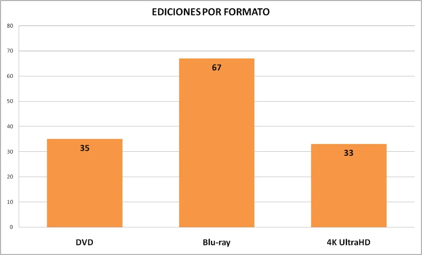 Si desglosamos un poco las cifras, el DVD ha aportado 35 ediciones, manteniendo su presencia estable en el mercado. Por su parte, el Blu-ray sigue siendo el formato dominante, con 67 ediciones, demostrando que sigue siendo el preferido para quienes buscan buena calidad sin dar el salto al 4K.