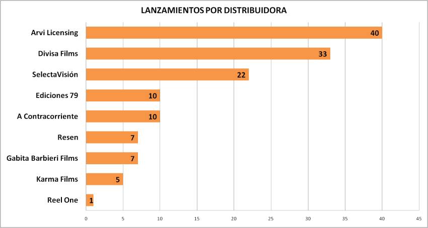 Tras ellas, un grupo de editoras que mantienen el pulso con constancia: Ediciones 79 y A Contracorriente, ambas con 10 lanzamientos, seguidas de Resen y Gabita Barbieri Films, con 7 cada una, y Karma Films, con 5 títulos este mes.