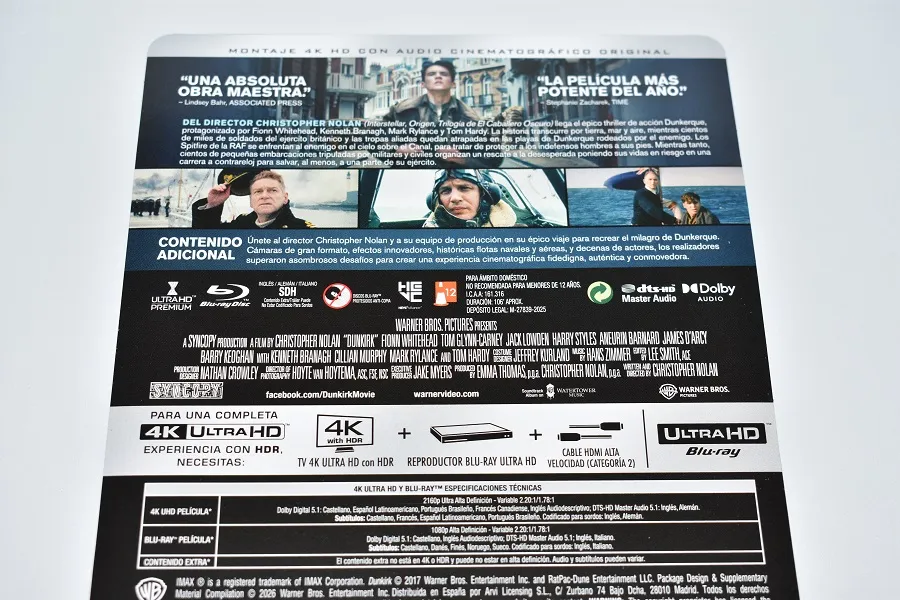 Todos los datos de la edición Steelbook de "Dunkerque" (4K UltraHD + Blu-ray) distribuida por Arvi Licensing bajo el sello de Warner Bros.. Disponible en tiendas desde el 25 de marzo de 2026.