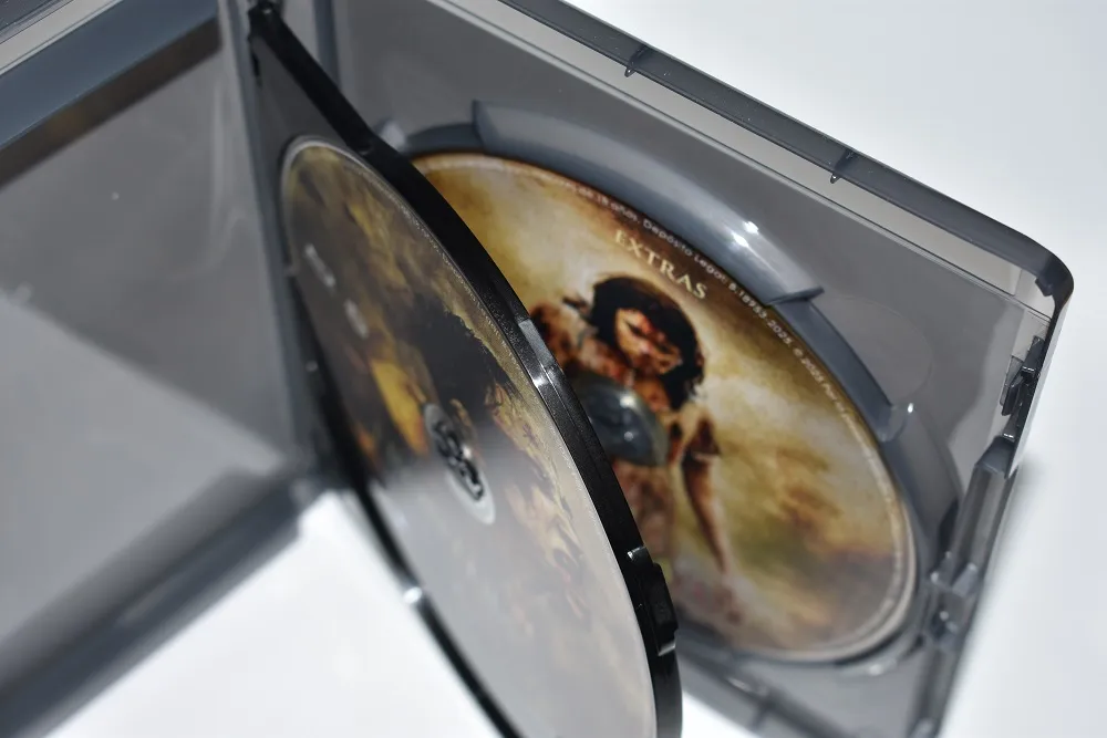 Y luego están los dos discos, cada uno con su propio arte (compartiendo diseños con la funda y el estuche): uno dedicado a la película y otro con contenido extra.