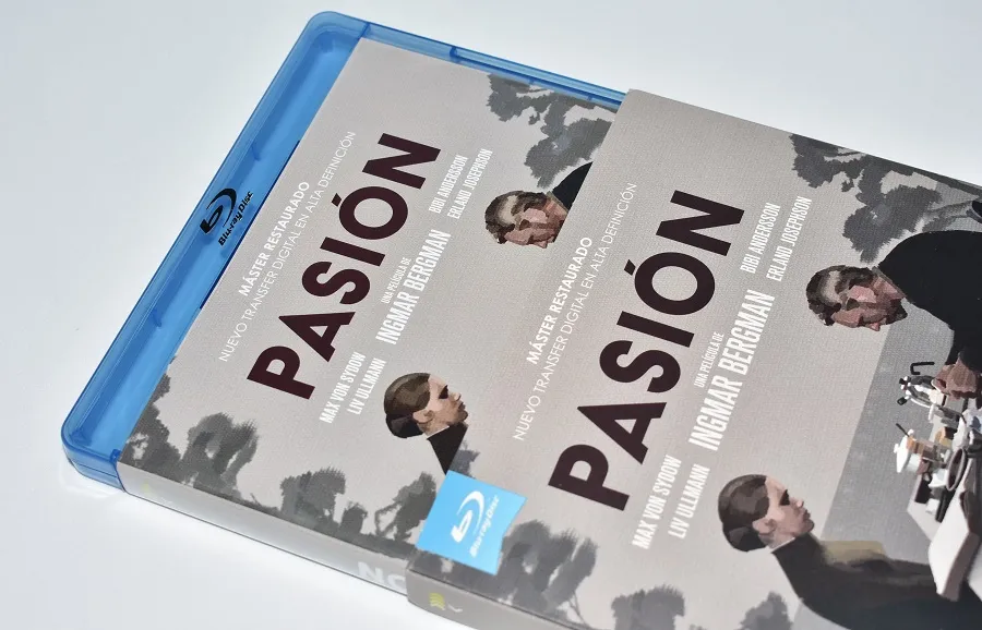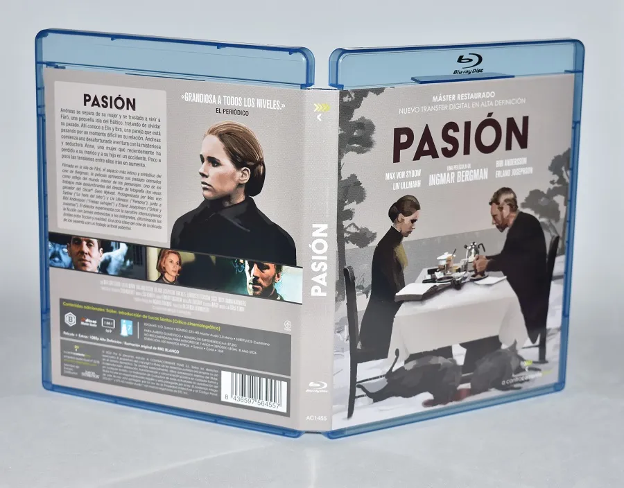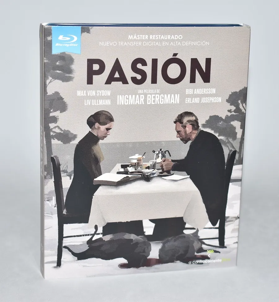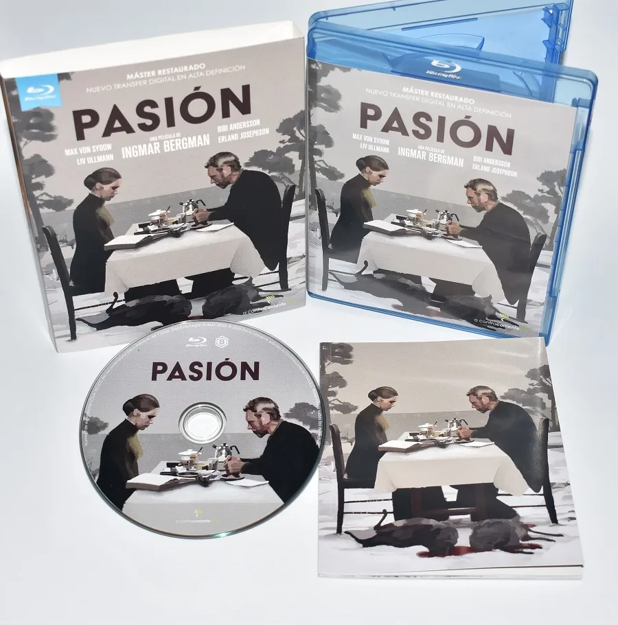 El arte del Blu-ray de Gritos y Susurros es directamente hipnótico: esas figuras femeninas, ese rojo dominante… transmite perfectamente la atmósfera de la peli. En cambio, el Blu-ray de Pasión apuesta por algo más frío y distante, muy acorde con su tono.