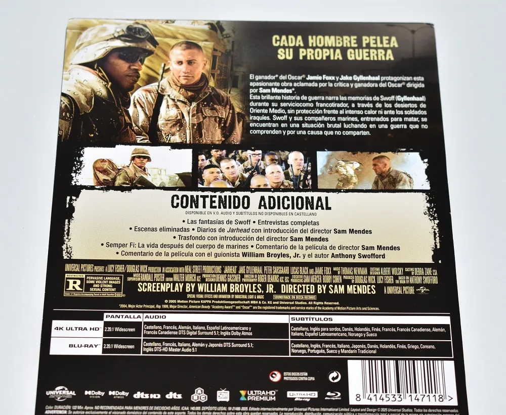 Y ahora, con esta nueva edición Steelbook 4K + Blu-ray de Jarhead que llega de la mano de Universal Pictures y distribuida por Arvi Licensing, toca revisitarla como se merece: en ultra alta definición, con buen sonido y con un embalaje elegante que le sienta de lujo a la película.
