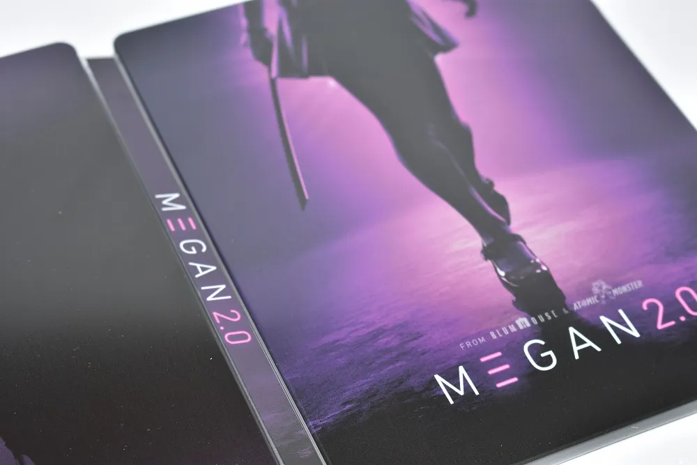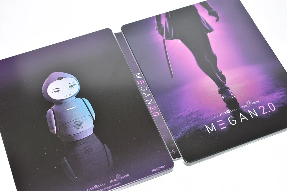 El Steelbook que ha llegado a España gracias a Arvi Licensing viene con un diseño que entra por los ojos: por fuera, la muñeca y su silueta amenazante bajo luces neón; por dentro, una ilustración de las dos «M3GAN» cara a cara.