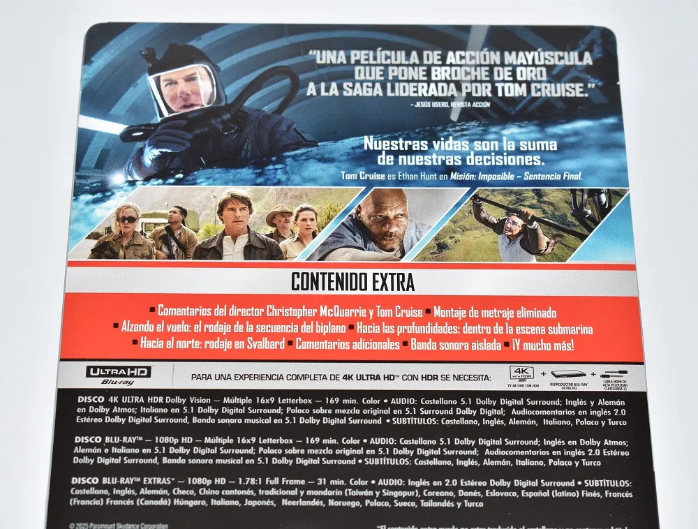 Esta edición Steelbook 4K + Blu-ray de Misión Imposible: Sentencia Final es justo lo que esperábamos de una superproducción de este calibre: una presentación de lujo, una imagen de infarto y un sonido que te sacude del sofá (sobre todo en su V.O.)