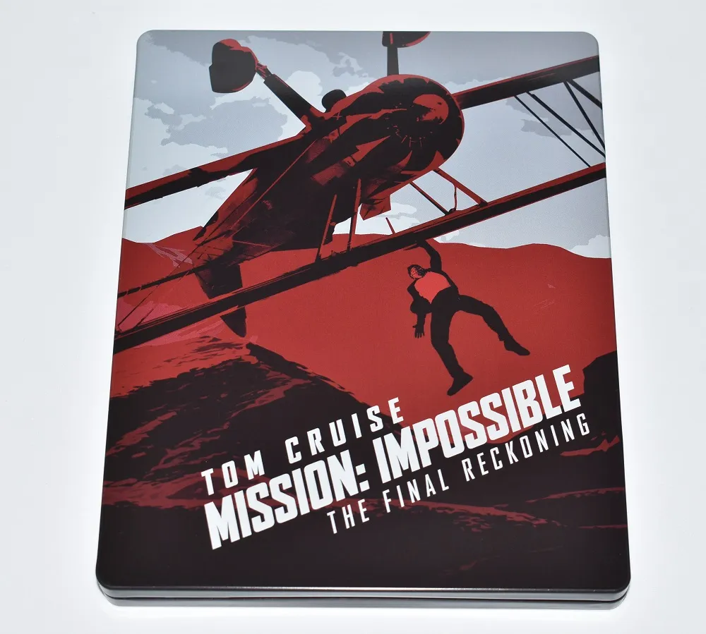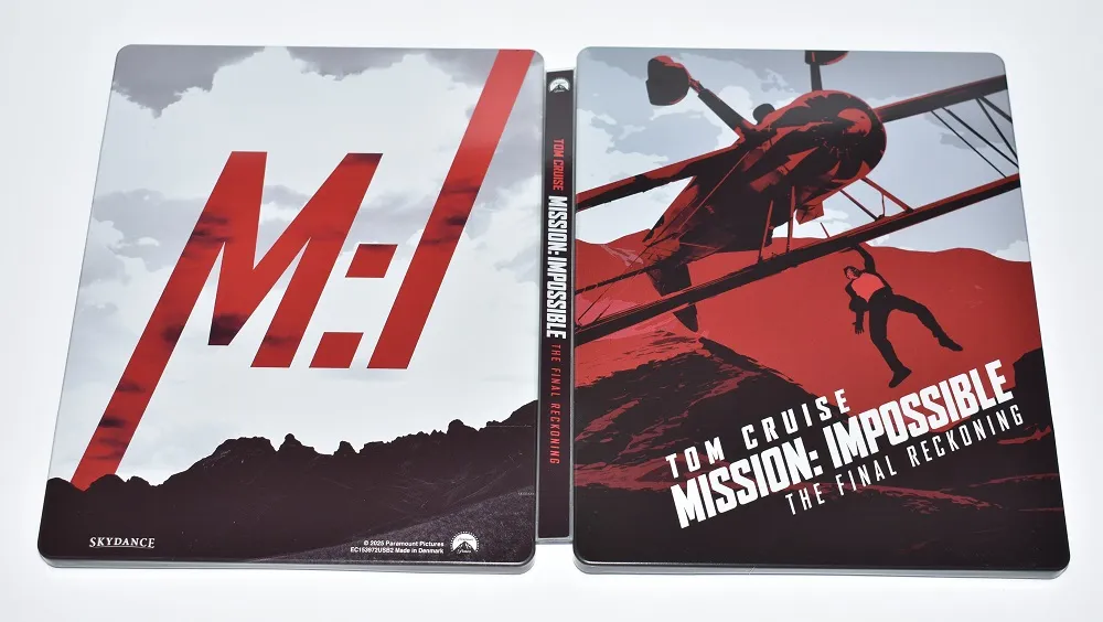 Por fuera, el diseño del steelbook es una pasada: tonos rojos y grises que capturan perfectamente la tensión y el vértigo de la famosa escena del avión, con Tom Cruise —cómo no— desafiando a la física y al sentido común.