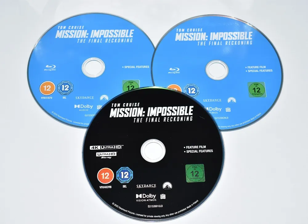 Los tres discos (dos Blu-ray y un 4K Ultra HD) completan la edición con un diseño sobrio: el color azul clásico de Paramount para los discos Blu-ray y el negro elegante para el disco 4K, con tipografías en blanco que mantienen la identidad visual de la saga.