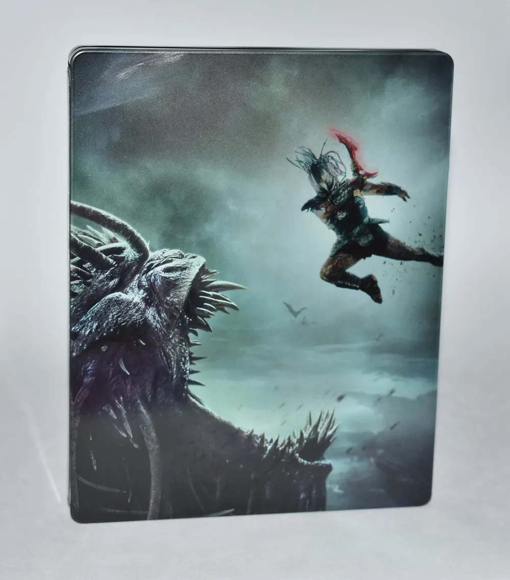 El Steelbook desplegado apuesta por una ilustración potente y atmosférica: tonos verdosos, ambiente brumoso y ese pedazo de criatura ocupando casi todo el encuadre mientras una figura salta al ataque en segundo plano. Es una imagen dinámica, con sensación de movimiento, muy en la línea aventurera de la película.