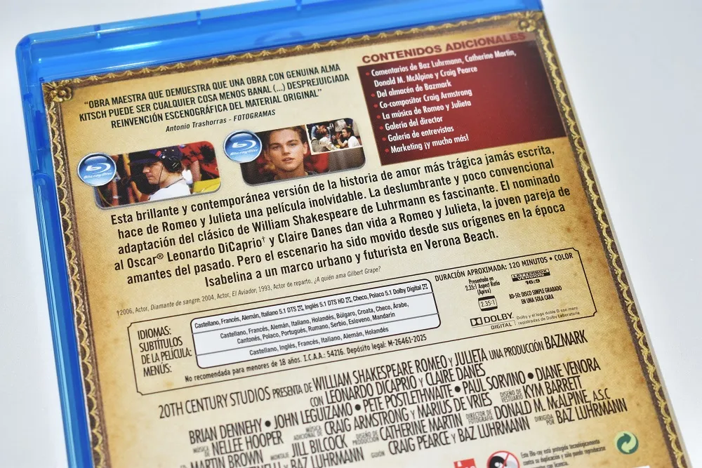 A nivel técnico, ofrece una imagen colorida y muy fiel al estilo visual de Baz Luhrmann, con buena definición y un audio sólido tanto en castellano (DTS 5.1) como en inglés (DTS-HD 5.1). No es una edición de referencia absoluta, pero sí una presentación muy competente para disfrutar de esta versión tan particular del clásico de Shakespeare.
