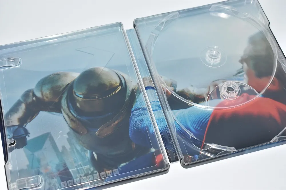 El interior del steelbook también se lo han currado. Dentro encontramos una imagen a doble cara con una escena de acción que enfrenta a Superman con uno de sus enemigos metálicos (que no voy a spoilear, pero ya sabes quién es si la has visto).