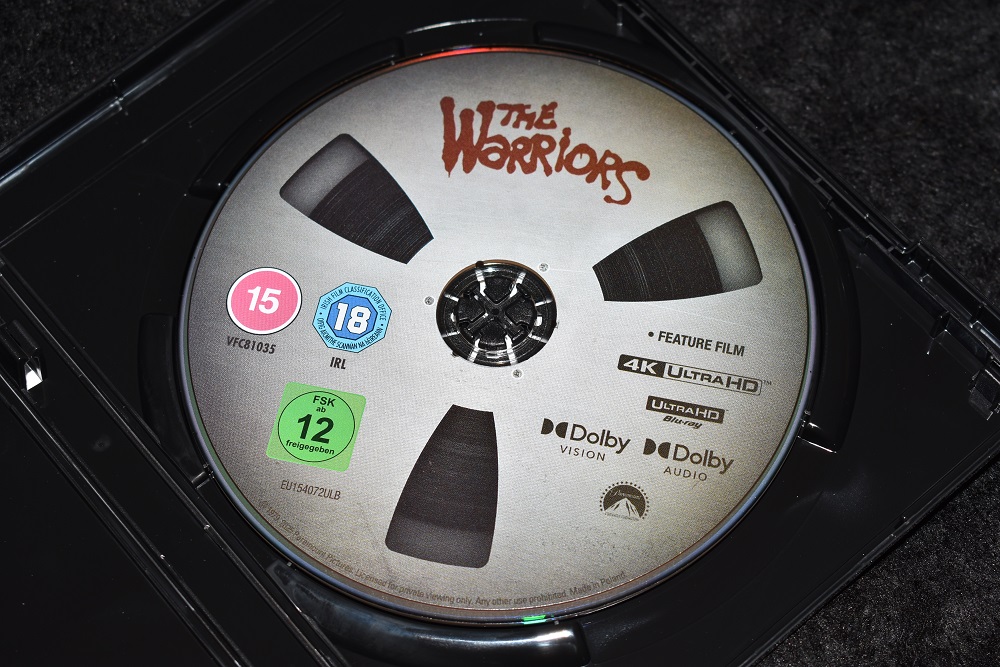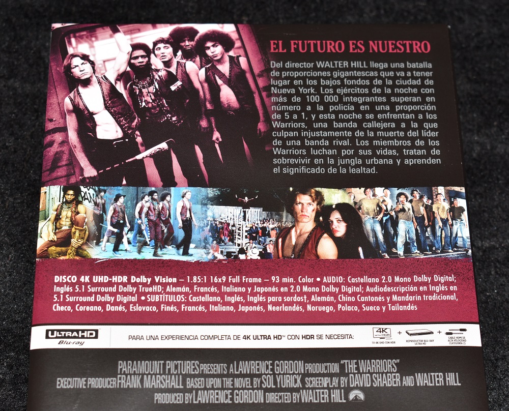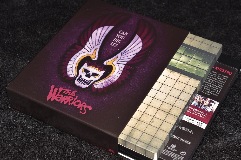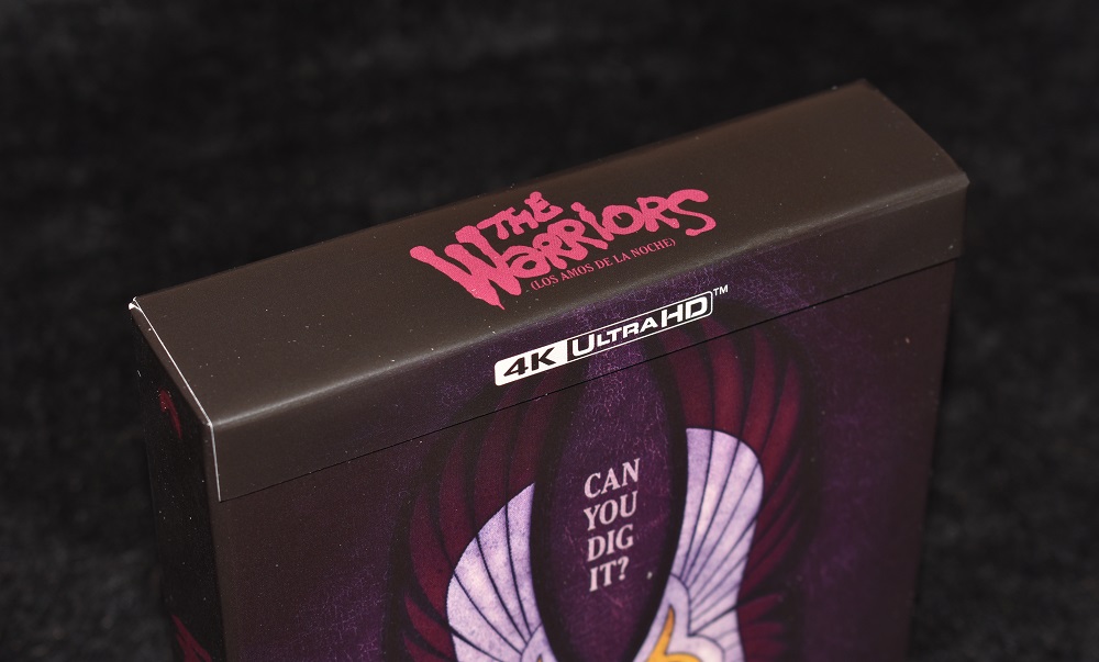 La funda rígida es pura actitud: tonos oscuros, arte nuevo que respira neón setentero y ese «CAN YOU DIG IT?» que solo leerlo ya te mete en ambiente. Dentro, el estuche 4K luce la mítica imagen del colectivo, con todos los Warriors listos para correr, pelear o ambas cosas al mismo tiempo.