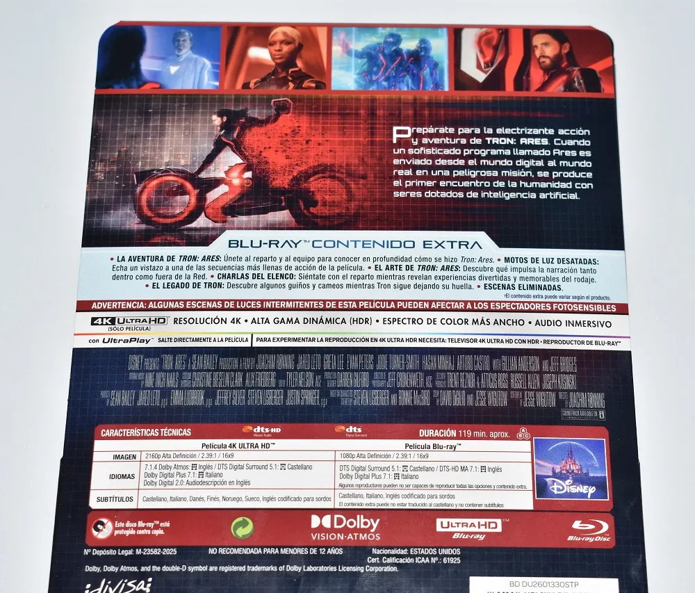 Todos los datos de la edición Steelbook 4K UltraHD + Blu-ray de "Tron: Ares" distribuida por Divisa Films bajo el sello de Disney. Disponible en tiendas desde el 21 de Enero de 2025.